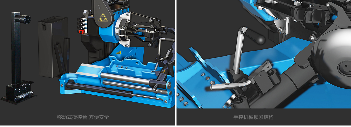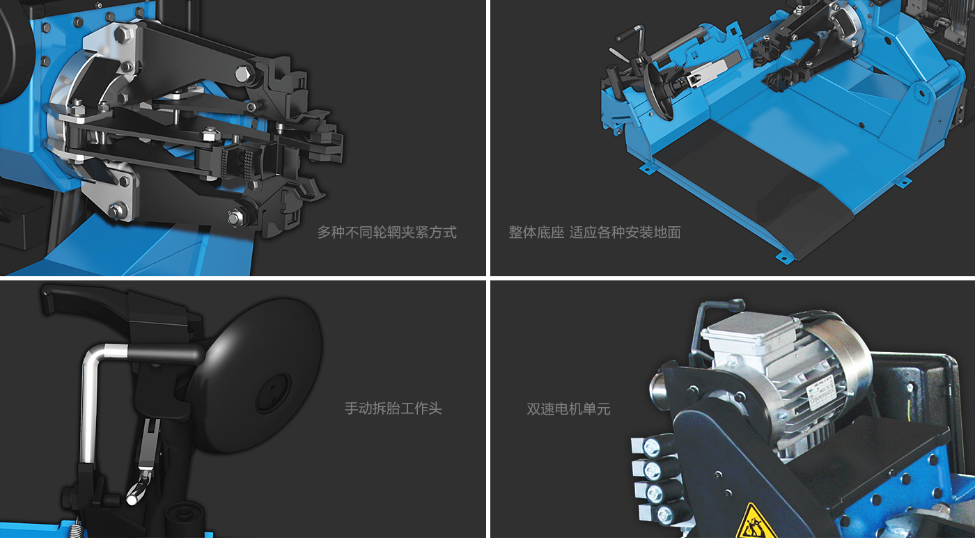 中型轮胎拆装机 特点: • 适用于小型和中型卡车轮胎。 • 手动拆胎工作头结构,使用灵活。 • 多种不同轮辋夹紧方式,实用性强。 • 手控机械锁紧结构,最大限度保证机器的安全性。 • 高强度合金材质涡轮减速箱,使用寿命长。 • 整体底座设计,适应各种安装地面。 • 标配双速电机单元,满足不同客户需求。 • 整机采用意大利进口电磁阀。 • 移动式操控台,方便安全。