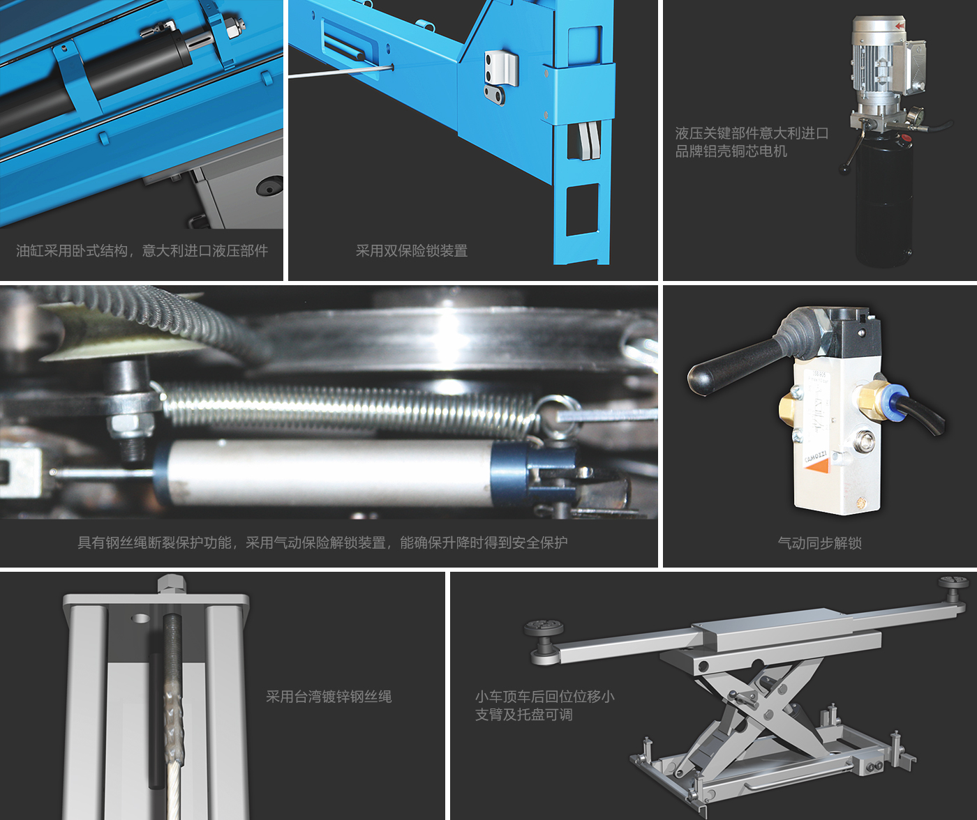 四柱式举升机 特点: • 整机采用高强度优质碳化钢,激光切割后机器人焊接成型,结构合理,性能优越。 • 标配高性能钢丝绳、链条。具有钢丝绳断裂保护功能,采用气动保险解锁装置,能确保升降时得到安全保护。 • 油缸采用卧式结构,意大利进口液压部件。 • 气动同步解锁。 • 液压关键部件意大利进口,品牌铝壳铜芯电机。 • 配有二次举升小车,小车顶车后回位位移小,支臂及托盘可调。 • 台面转角盘大扣槽位置可调。 • 采用双保险锁装置。 • 采用台湾镀锌钢丝绳。 |