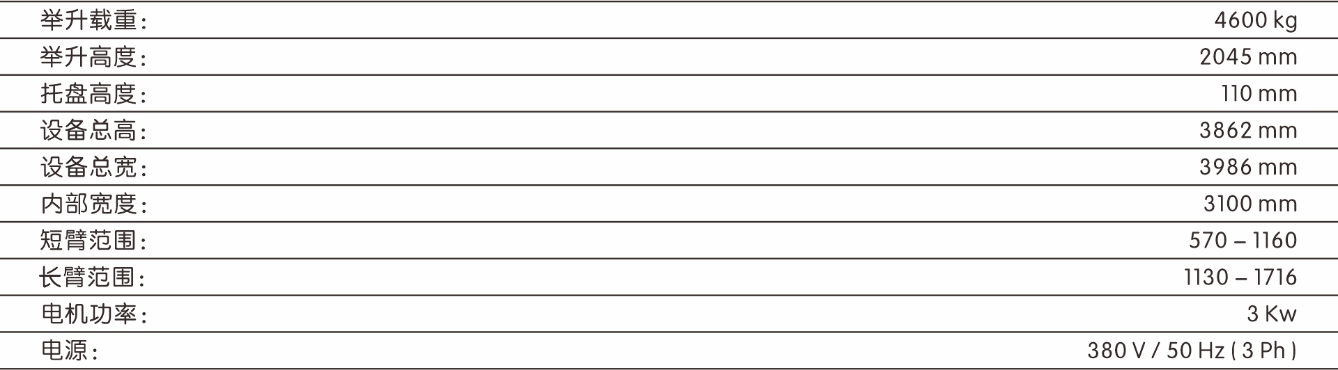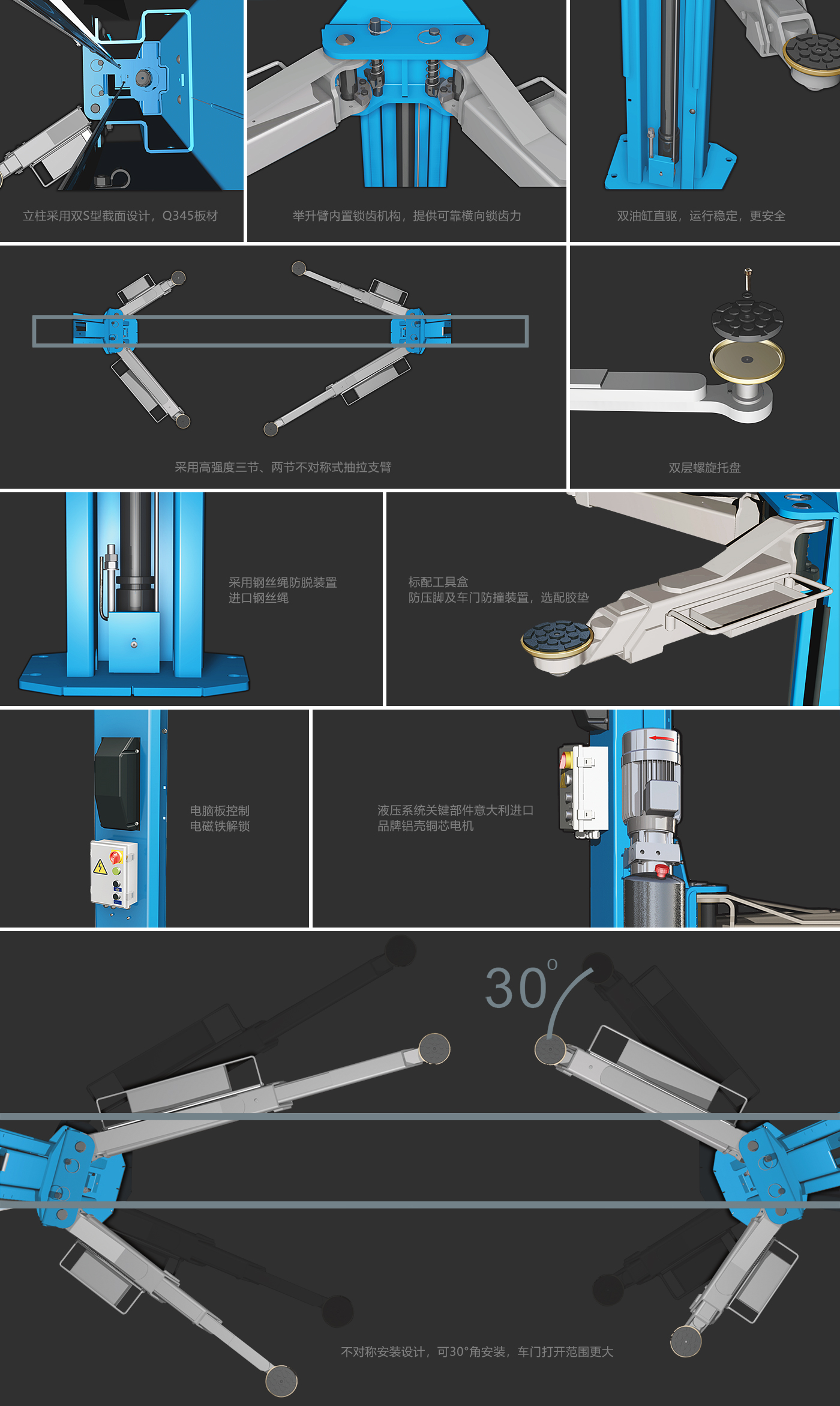 龙门式举升机 特点: • 立柱采用双S型截面设计,Q345板材。 • 双油缸直驱,运行稳定,更安全。 • 双层螺旋托盘。 • 举升臂内置锁齿机构,提供可靠横向锁齿力。 • 采用高强度三节、两节不对称式抽拉支臂。 • 标配工具盒、防压脚及车门防撞装置,选配胶垫。 • 电脑板控制,电磁铁解锁。 • 采用钢丝绳防脱装置、进口钢丝绳。 • 不对称安装设计,可30°角安装,车门打开范围更大。 • 液压系统关键部件意大利进口,品牌铝壳铜芯电机。 |