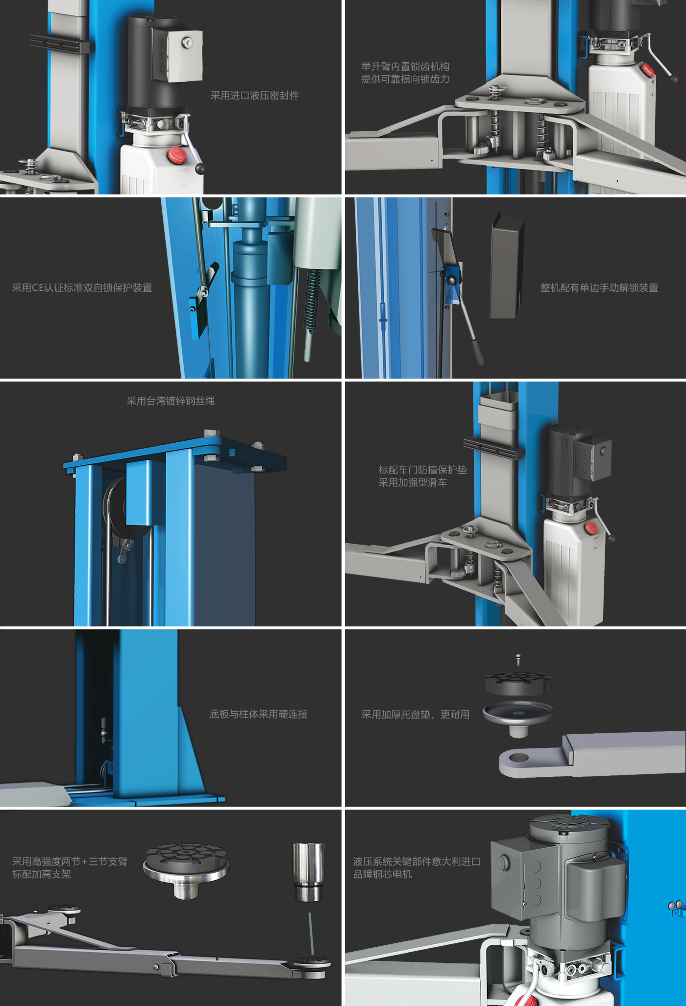 双柱式举升机 特点: • 采用进口液压密封件。 • 举升臂内置锁齿机构,提供可靠横向锁齿力。 • 采用CE认证标准双自锁保护装置。 • 整机配有单边手动解锁装置。 • 采用台湾镀锌钢丝绳。 • 标配车门防撞保护垫,采用加强型滑车。 • 底板与柱体采用硬连接。 • 采用加厚托盘垫,更耐用。 • 采用高强度两节+三节支臂,标配加高支架。 • 液压系统关键部件意大利进口,品牌铜芯电机。 |